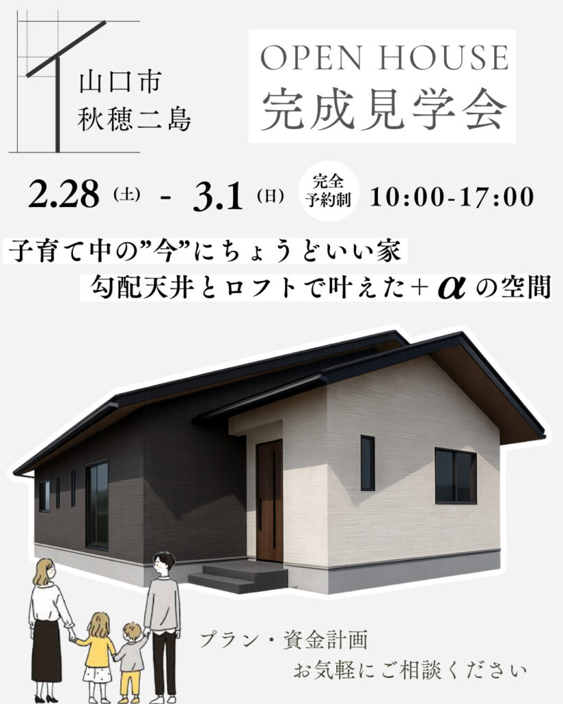 【完成見学会のご案内】2/28(土)、3/1(日)開催 子育て中の”今”にちょうどいい平屋の家
