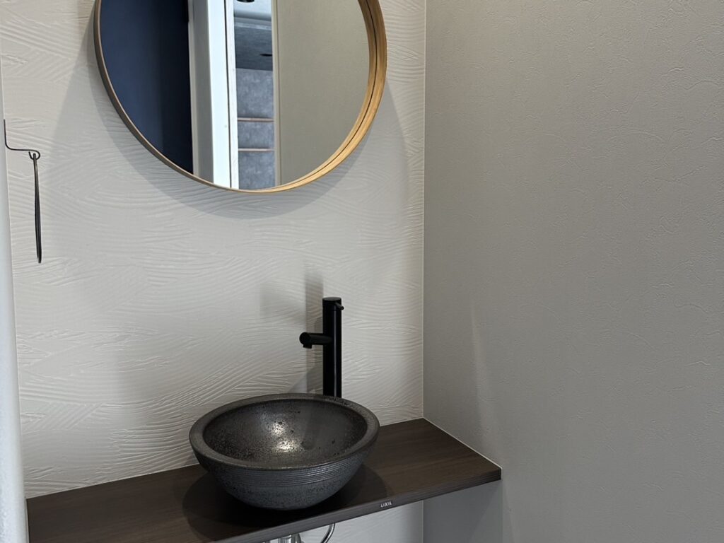 和モダン手洗い。丸鏡も良いアクセントに